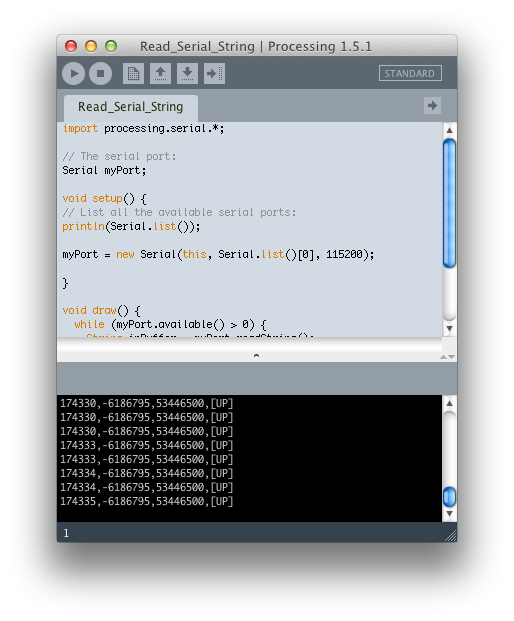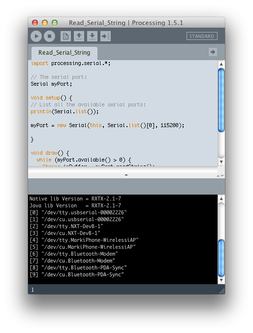 Take a look at the output on the Processing console below. You’ll see each serial device listed in turn, and /dev/tty.usbserial-000022226 in slot 0 is the XStick. My XStick is configured to run at 115200 baud (see my previous tutorial on how to do this).